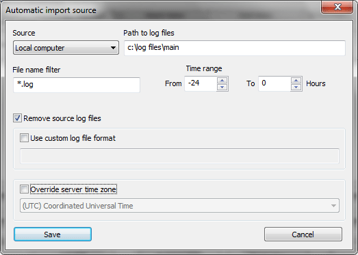 Source for log files can be a local computer or ftp server. You can create ftp accounts in the log file management window. Specify path to your log files (Path to log files field) and a mask of your log files (File name filter). File name filter field allows to use standard dos file mask syntax (* is for any number of any characters, ? is for single character) or put ] symbol at the start and use full regular expression syntax. Time range settings allows you to select log files based on current time range. In example: From -24 To 0 Hours will select files modified in the last 24 hours. There is no time zone corrections for these values so you may need to add or subtract some number of hours to match server time on your Log2Stats computer. Remove source log files _will_ remove all successfully imported log files so be careful with it. It really removes them. All imported log files are saved in the workspace's log files directory, however it is better to use original logs if you need to backup them because Log2Stats can sort lines in imported log files and remove duplicated information. |